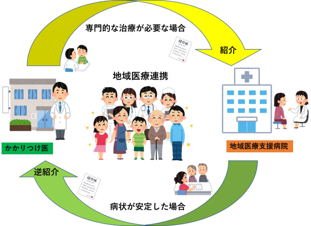 地域の医療機関で専門的な治療や検査が必要と判断された場合は、紹介状を持って受診いただきますようお願いいたします。当院での急性期治療を終えて、症状が安定した患者さんは、「かかりつけ医」に紹介させていただきます。