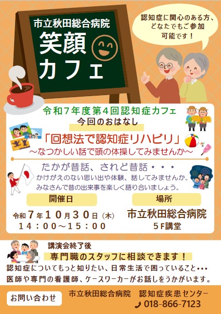 当院では、認知症の方やご家族の方、地域住民、専門職など、どなたでも参加でき、交流を図ることができる笑顔カフェを開いておりますので、ぜひ、お気軽にお越しください。