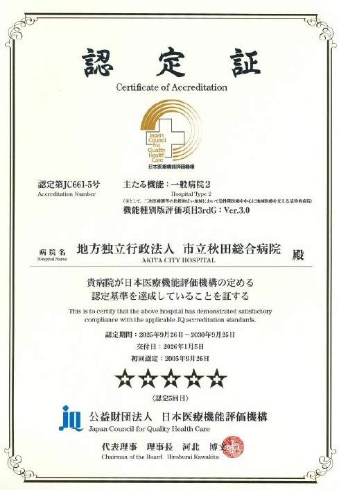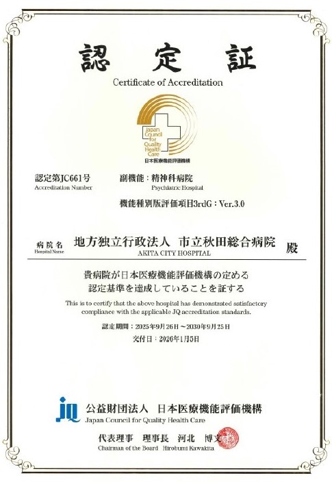 その後、新たな評価項目による更新審査を受審した結果、平成23年7月1日付けで「一般病院、ver.6.0」の認定を受け、2回目の更新審査の受審では、平成28年1月16日付けで「一般病院2(主として、二次医療圏等の比較的広い地域において急性期医療を中心に地域医療を支える基幹的病院)、3rdG:Ver.1.1」と「副機能:精神科病院、3rdG:Ver.1.1」の認定を受けました。さらに、3回目の更新審査では、令和3年12月3日付けで「一般病院2(主として、二次医療圏等の比較的広い地域において急性期医療を中心に地域医療を支える基幹的病院)、3rdG:Ver.2.0」と「副機能:精神科病院、3rdG:Ver.2.0」の認定を受けました。